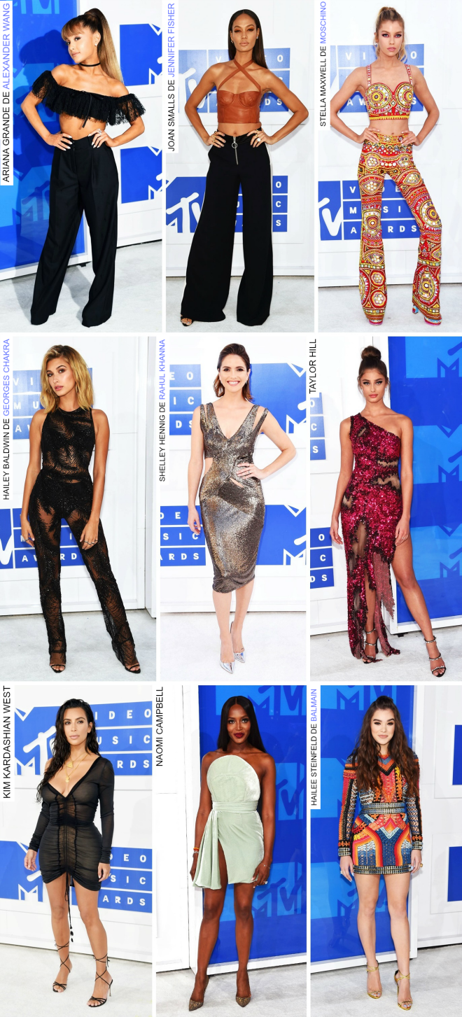 Quando o assunto é tapete vermelho - no caso branco - o VMAs sempre deixa a desejar, não é lá um red carpet muito glamouroso e por isso os looks são meio...naaahhh Mas vejamos, está cada vez mais comum vermos produções com calça nos tapetes da vida e nesse não foi diferente, Ariana Grande, Joan Smalls e Stella Maxwell apostaram no combo cropped + calça e cada uma no seu estilo, uma boa opção da sair do vestido que é sempre obvio.
